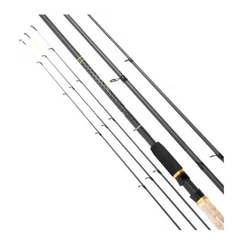 Feederis turi tris skirtingo jautrumo ir lankstumo viršūnėles, kurias galima keisti norint užmesti sunkesnius masalus arba matyti pačius jautriausius žuvies kibimus. Su salotine viršūne meškerykotis pasidaro kietesnis ir mažiau jautrus, kas patogu gaudant srovėje, o su žalia arba raudona viršūnėle meškerė tampa liaubesnė ir daug jautresnė. Feederis yra ganėtinai nesunkus, sveria tik 230 g ir puikiai perduoda žuvies smūgius ir laimikio traukimą padaro begalo maloniu ir nepamirštamu. Stambūs meškerykočio žiedeliai pelengvina žvejybą, nes per juos puikiai prasitraukia mazgai ir nesikabina papildomi kliūviniai. Šią dugninę meškerę galima rinktis iš dviejų dydžių 3,6 m ir 3,9 m, pagal jūsų patogumą ir žvejybos būdą. Jei dažniau žvejojate tolimose distancijose, siūlome rinktis šiek tiek ilgesnį meškerykotį, jei žvejojate iš arčiau arba užmetimas yra ganėtinai sunkus ir nepatogus, puikiai tiks trumpesnė dugninė meškerė.