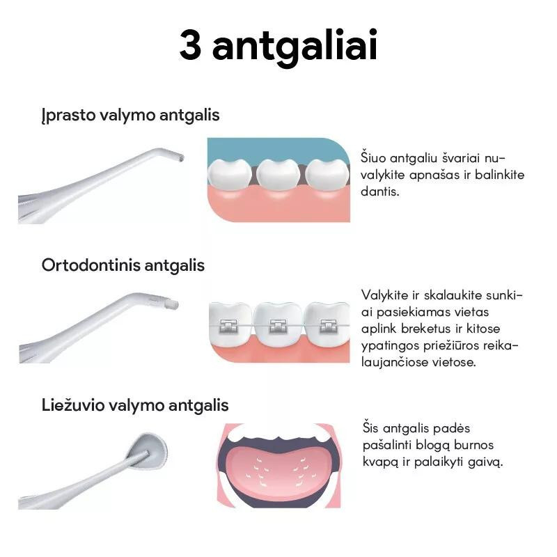 • Ortodontinis antgalis. Valykite ir skalaukite sunkiai pasiekiamas vietas aplink breketus ir kitose ypatingos priežiūros reikalaujančiose vietose.