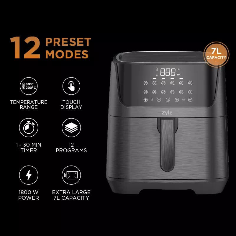 Ši „Zyle“ karšto oro gruzdintuvė turi ekraną su liečiamais mygtukais, kuriais lengvai pasirinksite vieną iš 12 automatinių gruzdinimo programų arba galėsite papildomai reguliuoti kepimo laiką ir temperatūrą pagal savo poreikius.