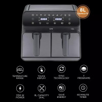 Galingumas: 1700 W; Įtampa: 220-240 V; Karšto oro technologija sveikesniam maistui; Karšto oro gruzdintuvės talpa: 8 l ( 2 x 4 l); Sinchronizavimo funkcija leidžia suvienodinti abiejų kepimo krepšelių maisto ruošimo trukmę, kad jie būtų paruošti tuo pat metu. Priminimo funkcija, kad reikia supurtyti kepamą maistą; Reguliuojama temperatūra: 60-200°C; 7 skirtingos maisto ruošimo programos; Nelimpanti gruzdinimo indų talpa; Laikmatis: iki 60 minučių; Liečiamas LED ekranas; Išmatavimai: 36 x 28 x 31 cm Svarbu: vadovaukitės informacija, pateikta internetiniame puslapyje.