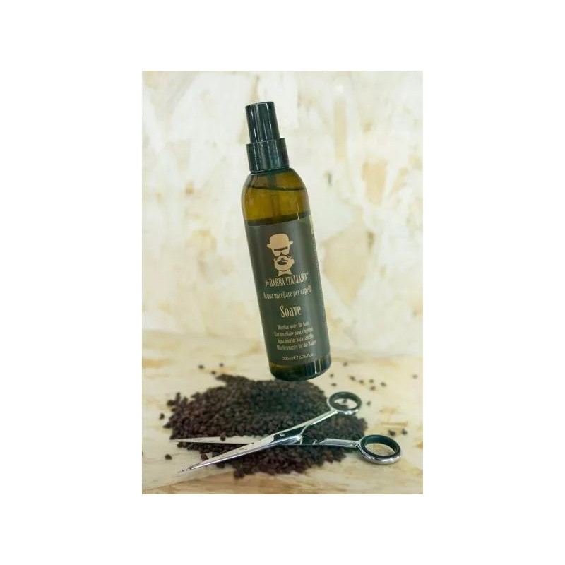 „Barba Italiana“ plaukams ir barzdai skirtas micelinis vanduo glotnina, palengvina iššukavimą bei atstato plaukus. Leidžia lengviau iššukuoti plaukus kirpimo metu. Priemonės sudėtyje esantis vynuogių sėklų aliejus ir smilkalinių bosvelijų aliejus pasižymi plaukus pripildančiomis antioksidantais bei energizuojančiomis savybėmis. Micelinis vanduo praturtintas eteriniais pačiulių ir Ylang - Ylang aliejais, kurie padeda pašalinti formavimo priemonių likučius iš plaukų.