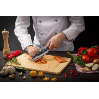 „Santoku“ išvertus iš japonų k. reiškia trys privalumai, nes juo galima pjaustyti riekelėmis, smulkinti ir pjaustyti kubeliais visus tris pagrindinius produktus - mėsą, daržoves ir žuvį. Tai tradicinis, japoniškas peilis, nepakeičiamas tikriems virtuvės šefams.
