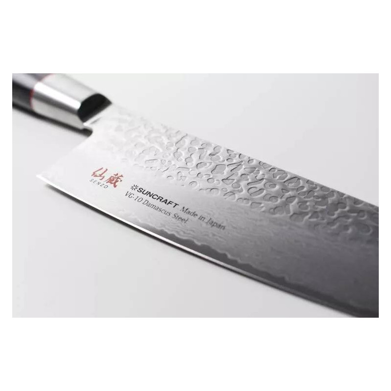 Suncraft „Senzo“ klasikinės kolekcijos peiliai yra pagaminti iš 33 Damasko nerūdijančio plieno sluoksnių su VG10 šerdimi. Šie peiliai iš abiejų pusių turi po 16 minkštų plieno sluoksnių. Jie yra ypatingai aštrūs, tvirti ir viršuje turi įpjovas, kurios neleidžia riebaluotiems, aliejuotiems bei krakmolingiems produktams prilipti prie peilio. Plieninė peilio dalis atskirta nuo kietmedžio rankenos plonyčiu, raudonu, karščiui atspariu žiedu, kuris leidžia tiek plienui, tiek medienai saugiai plėstis bei susitraukti įvairiais greičiais ypatingai aukštose temperatūrose. Tai peiliai - tikriems virtuvėms meistrams.